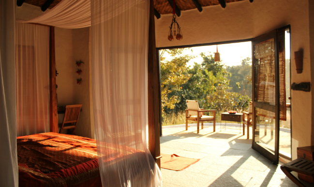The accommodation is a thing of beauty. Built in the local style, the cottages have eighteen-inch-thick brick walls, plastered in mud and cow dung and coated with white limestone, which provides excellent insulation from heat and cold and acts as a natural insect repellent. Done up comfortably, with a verandah and courtyard and with many seating niches, the walls are embossed with friezes of vines and flowers. The striking features are the outdoor but secluded shower area and the outdoor day bed. The day bed is likely to become a favourite spot for listening to the calls of the wild or to count the stars at night.