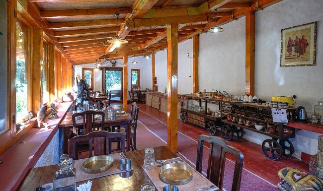 The pretty dining room, cafe Swayambhu, with its large picture windows and crackling fireplace draws travellers with its delicious local Kumaoni food. Since the lodge falls in a pilgrimage zone, it serves only vegetarian food. The Kumaoni thali is a must try.
